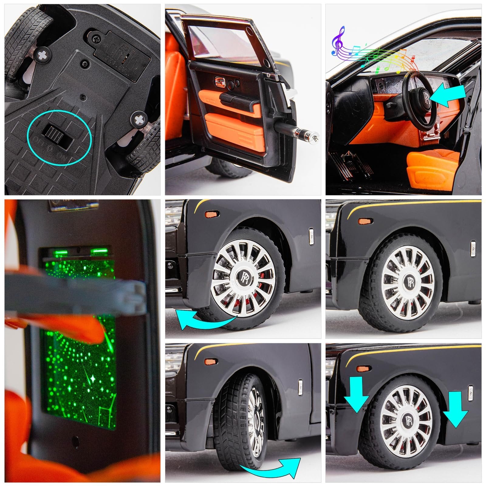 【Function Play】Front and back doors, hood and car trunk can be opened; three gears switch, respectively off, on and light mode. Different play styles can be selected according to different situations. Installation of strong pull back device, can slide on the smooth desktop. With ultra-luxurious lighting effects and sound effects, the starry top in Rolls Royce can be changed to multiple colors and multiple different sound effects.