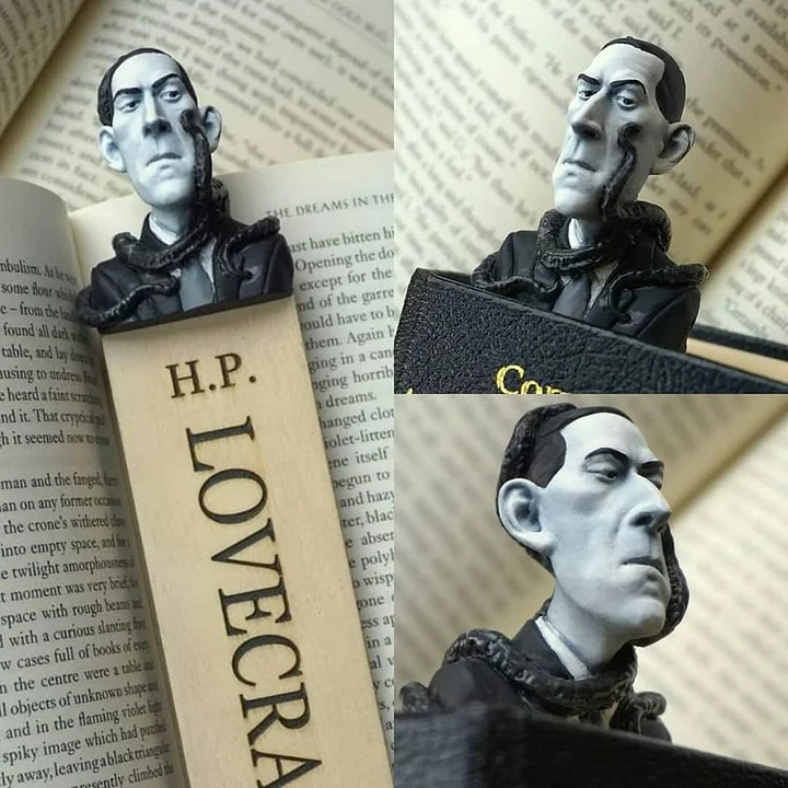 šHand sculpted, a caricaturised portrait ofĀ H.P. Lovecraft atop a smooth,Ā varnished wooden bookmark, withĀ "H.P. Lovecraft"Ā laser engraved upon it.